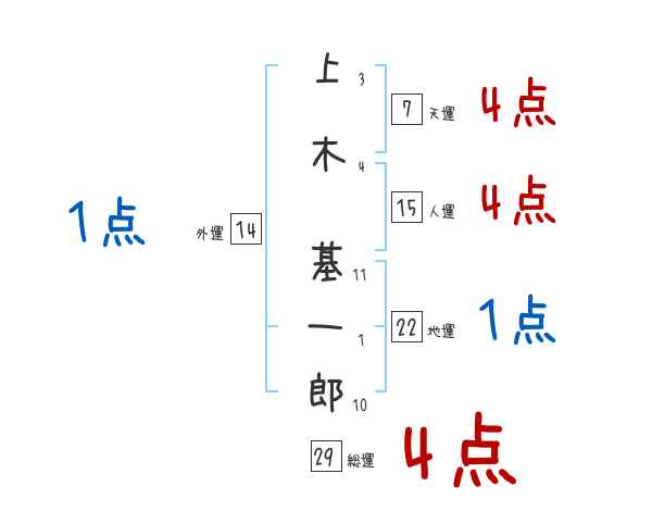 外運![]() | 上木基一郎さんの外運は14画の1つ星!人に対して優しいがストレスを溜め込みがち。人間関係のトラブルを避けるよう気をつけましょう。 生活面を象徴する運勢です。外部から受ける影響力を表し、結婚運、家庭運や職場、環境への順応性を表します。 |
