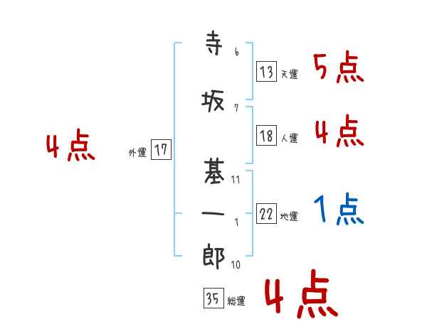 外運![]() | 寺坂基一郎さんの外運は17画の4つ星!積極的な行動力。地位を気づき財産を手に入れる。純粋な心と直感力。 生活面を象徴する運勢です。外部から受ける影響力を表し、結婚運、家庭運や職場、環境への順応性を表します。 |