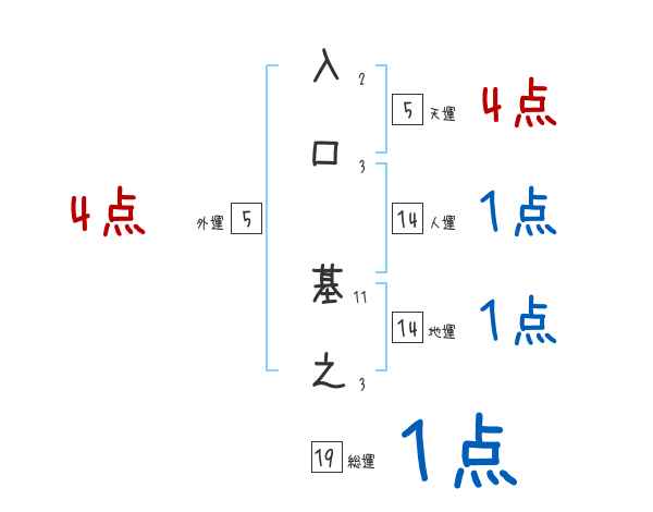 天運![]() | 入口基之さんの天運は5画の4つ星!健康で安泰。協調性に優れ、財産に恵まれる。 家系が持つ宿命的な運勢を表します。祖先から受け継いだ苗字ですので自分の力が及びません。家柄を象徴します。 |