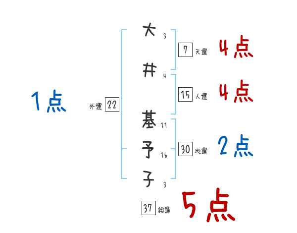 総運![]() | 大井基予子さんの総運は37画の5つ星!努力家で順応性に優れる。現実的な考え方ができ忠実に物事をこなす。 あなたの人生を表す1番重要な運勢です。生涯を通じて影響する総合運となり、主に50歳以降の晩年期に影響を及ぼします。 |