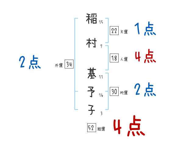 外運![]() | 稲村基予子さんの外運は34画の2つ星!独創性に優れるが、自尊心が強く災難に注意しましょう。 生活面を象徴する運勢です。外部から受ける影響力を表し、結婚運、家庭運や職場、環境への順応性を表します。 |