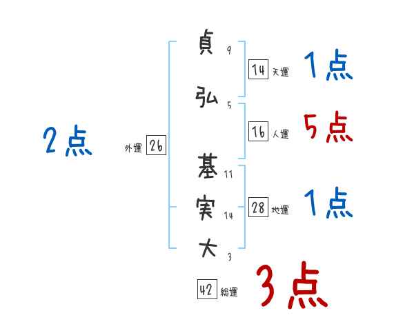 人運![]() | 貞弘基実大さんの人運は16画の5つ星!人望が厚く大きく発展する。逆転成功が見える。 性格や才能などを表す2番目に重要な運勢です。人間関係や協調性、社会的な成功に影響します。主に20歳から50歳ぐらいまでの中年期の運勢を表します。 |