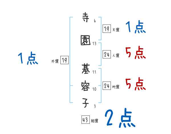 外運![]() | 寺園基容子さんの外運は19画の1つ星!優れた才能を持ちますが、協調性が足りないことも。周りの人と協力する事を意識しましょう。 生活面を象徴する運勢です。外部から受ける影響力を表し、結婚運、家庭運や職場、環境への順応性を表します。 |