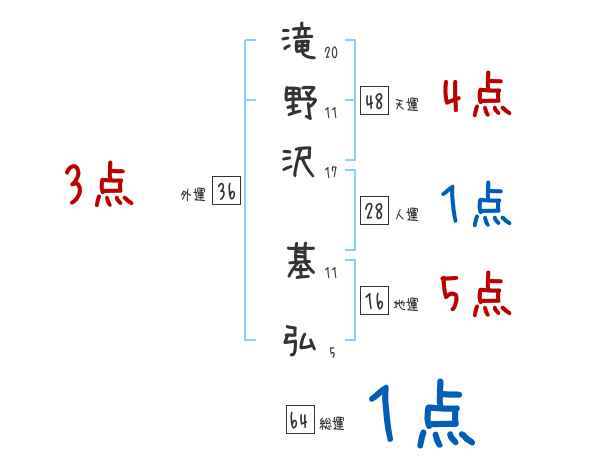 天運![]() | 滝野沢基弘さんの天運は48画の4つ星!賢明な性格で人望が厚い。指導力があり多くの人に尊敬される。 家系が持つ宿命的な運勢を表します。祖先から受け継いだ苗字ですので自分の力が及びません。家柄を象徴します。 |