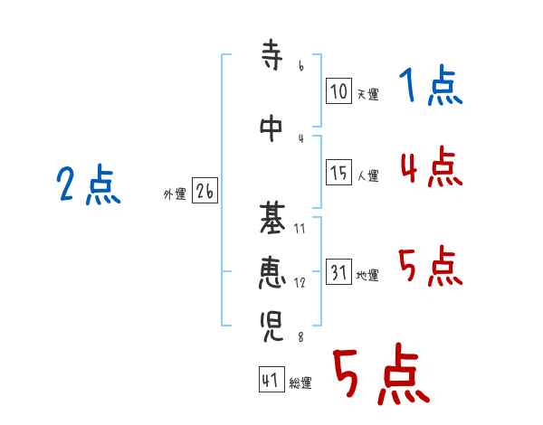 外運![]() | 寺中基恵児さんの外運は26画の2つ星!波瀾万丈かも。信頼できる人を大事にしましょう。 生活面を象徴する運勢です。外部から受ける影響力を表し、結婚運、家庭運や職場、環境への順応性を表します。 |