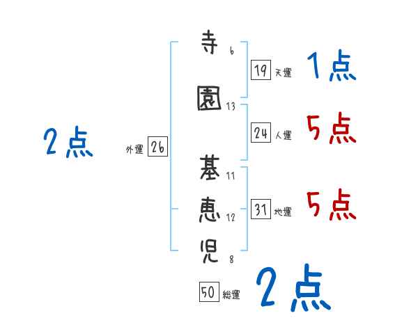 外運![]() | 寺園基恵児さんの外運は26画の2つ星!波瀾万丈かも。信頼できる人を大事にしましょう。 生活面を象徴する運勢です。外部から受ける影響力を表し、結婚運、家庭運や職場、環境への順応性を表します。 |