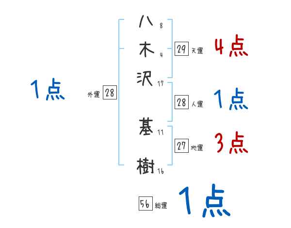 人運![]() | 八木沢基樹さんの人運は28画の1つ星!家庭環境に注意。スポーツで活躍できる能力があるかも。 性格や才能などを表す2番目に重要な運勢です。人間関係や協調性、社会的な成功に影響します。主に20歳から50歳ぐらいまでの中年期の運勢を表します。 |