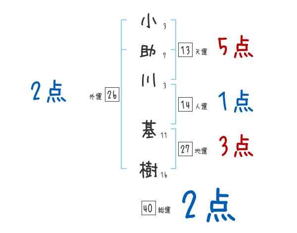 外運![]() | 小助川基樹さんの外運は26画の2つ星!波瀾万丈かも。信頼できる人を大事にしましょう。 生活面を象徴する運勢です。外部から受ける影響力を表し、結婚運、家庭運や職場、環境への順応性を表します。 |