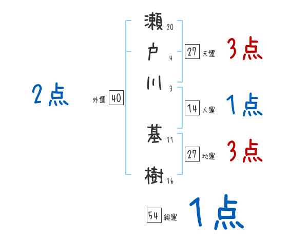 総運![]() | 瀬戸川基樹さんの総運は54画の1つ星!トラブルが多いかも。周りをよく見て協調して過ごしましょう。 あなたの人生を表す1番重要な運勢です。生涯を通じて影響する総合運となり、主に50歳以降の晩年期に影響を及ぼします。 |