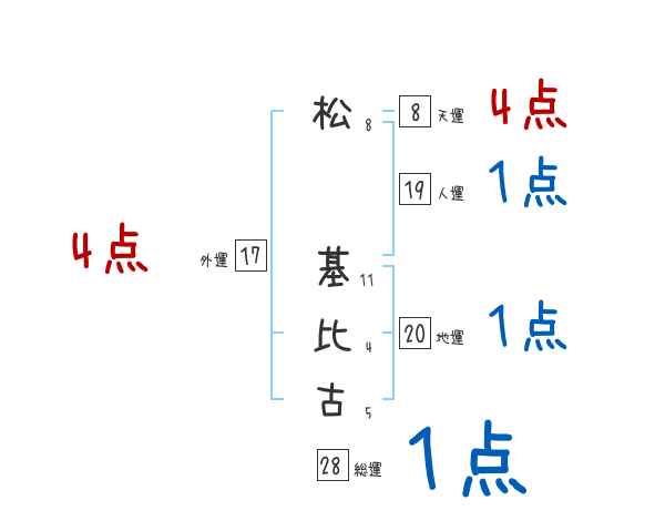 天運![]() | 松基比古さんの天運は8画の4つ星!勤勉家。根気強く努力し成功する。忍耐力がある。 家系が持つ宿命的な運勢を表します。祖先から受け継いだ苗字ですので自分の力が及びません。家柄を象徴します。 |