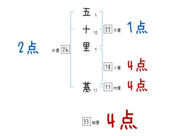 天運![]() | 五十里基さんの天運は22画の1つ星!努力することが苦手ないっぽう手先が器用。芸術性にも優れる。 家系が持つ宿命的な運勢を表します。祖先から受け継いだ苗字ですので自分の力が及びません。家柄を象徴します。 |