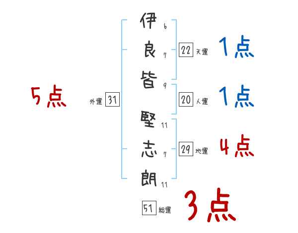 総運![]() | 伊良皆堅志朗さんの総運は51画の3つ星!変化が激しく、危険に注意。堅実な性格。 あなたの人生を表す1番重要な運勢です。生涯を通じて影響する総合運となり、主に50歳以降の晩年期に影響を及ぼします。 |