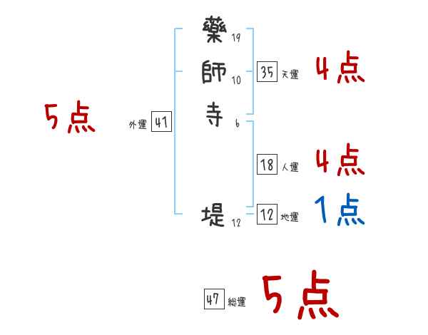 総運![]() | 藥師寺堤さんの総運は47画の5つ星!実力が開花し発展する円満な人生。財に恵まれる。 あなたの人生を表す1番重要な運勢です。生涯を通じて影響する総合運となり、主に50歳以降の晩年期に影響を及ぼします。 |