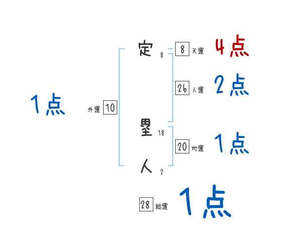 総運![]() | 定塁人さんの総運は28画の1つ星!家庭環境に注意。スポーツで活躍できる能力があるかも。 あなたの人生を表す1番重要な運勢です。生涯を通じて影響する総合運となり、主に50歳以降の晩年期に影響を及ぼします。 |