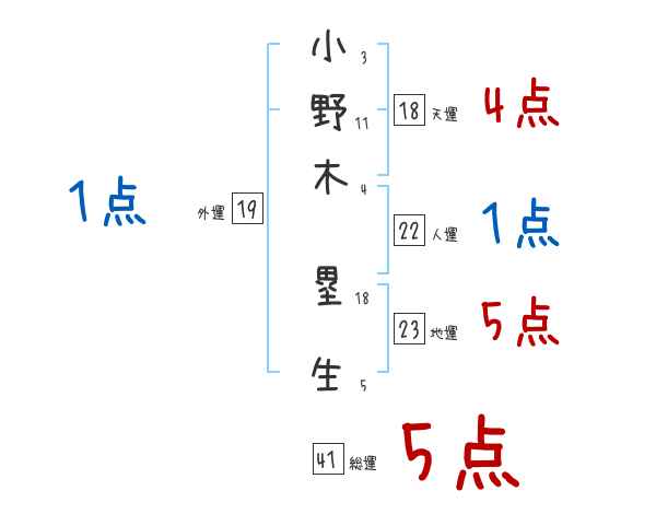 外運![]() | 小野木塁生さんの外運は19画の1つ星!優れた才能を持ちますが、協調性が足りないことも。周りの人と協力する事を意識しましょう。 生活面を象徴する運勢です。外部から受ける影響力を表し、結婚運、家庭運や職場、環境への順応性を表します。 |