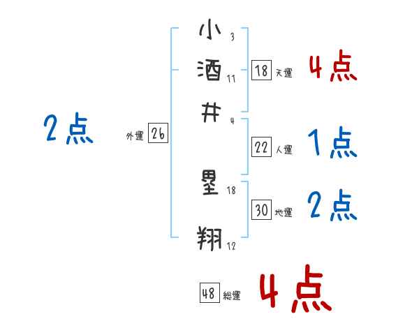 外運![]() | 小酒井塁翔さんの外運は26画の2つ星!波瀾万丈かも。信頼できる人を大事にしましょう。 生活面を象徴する運勢です。外部から受ける影響力を表し、結婚運、家庭運や職場、環境への順応性を表します。 |
