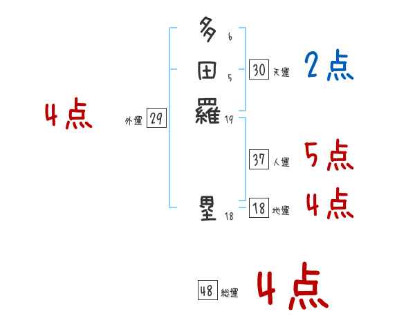 天運![]() | 多田羅塁さんの天運は30画の2つ星!浮き沈みの激しさに注意しましょう。 家系が持つ宿命的な運勢を表します。祖先から受け継いだ苗字ですので自分の力が及びません。家柄を象徴します。 |