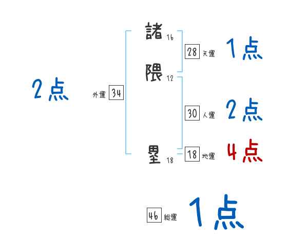 外運![]() | 諸隈塁さんの外運は34画の2つ星!独創性に優れるが、自尊心が強く災難に注意しましょう。 生活面を象徴する運勢です。外部から受ける影響力を表し、結婚運、家庭運や職場、環境への順応性を表します。 |