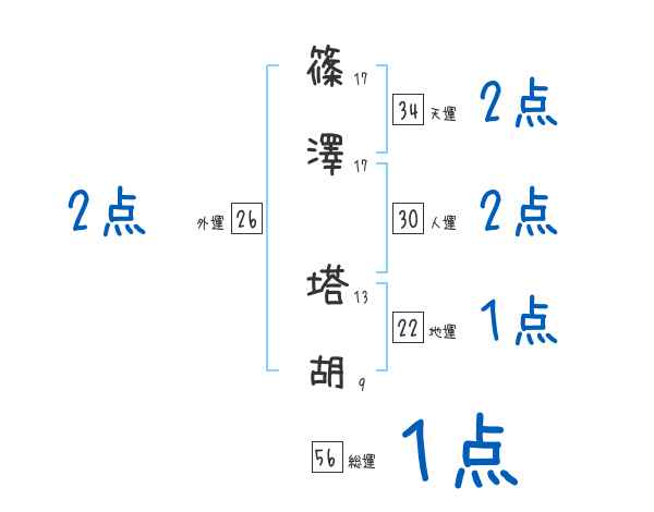 外運![]() | 篠澤塔胡さんの外運は26画の2つ星!波瀾万丈かも。信頼できる人を大事にしましょう。 生活面を象徴する運勢です。外部から受ける影響力を表し、結婚運、家庭運や職場、環境への順応性を表します。 |