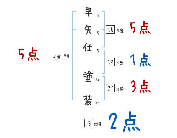 外運![]() | 早矢仕塗装さんの外運は24画の5つ星!家庭運が良く順調な人生。金運にも恵まれる。 生活面を象徴する運勢です。外部から受ける影響力を表し、結婚運、家庭運や職場、環境への順応性を表します。 |
