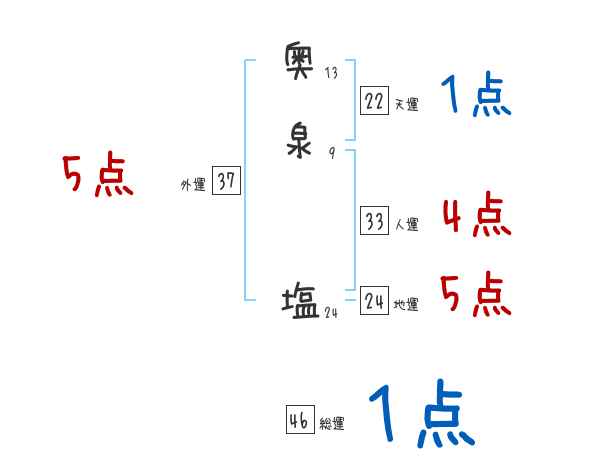 総運![]() | 奥泉塩さんの総運は46画の1つ星!迷走することが多く苦労するかも。目先のことにとらわれないように。 あなたの人生を表す1番重要な運勢です。生涯を通じて影響する総合運となり、主に50歳以降の晩年期に影響を及ぼします。 |