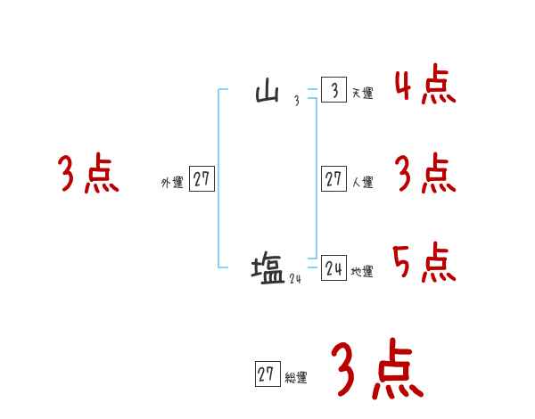 総運![]() | 山塩さんの総運は27画の3つ星!頭脳明晰だが強情で摩擦が多い傾向。孤立に注意。 あなたの人生を表す1番重要な運勢です。生涯を通じて影響する総合運となり、主に50歳以降の晩年期に影響を及ぼします。 |