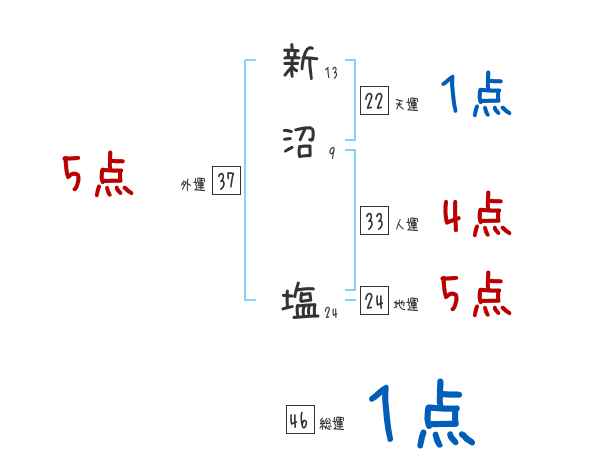 天運![]() | 新沼塩さんの天運は22画の1つ星!努力することが苦手ないっぽう手先が器用。芸術性にも優れる。 家系が持つ宿命的な運勢を表します。祖先から受け継いだ苗字ですので自分の力が及びません。家柄を象徴します。 |