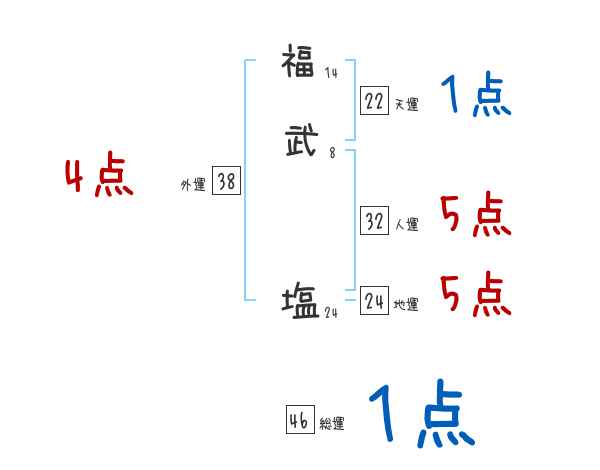 総運![]() | 福武塩さんの総運は46画の1つ星!迷走することが多く苦労するかも。目先のことにとらわれないように。 あなたの人生を表す1番重要な運勢です。生涯を通じて影響する総合運となり、主に50歳以降の晩年期に影響を及ぼします。 |