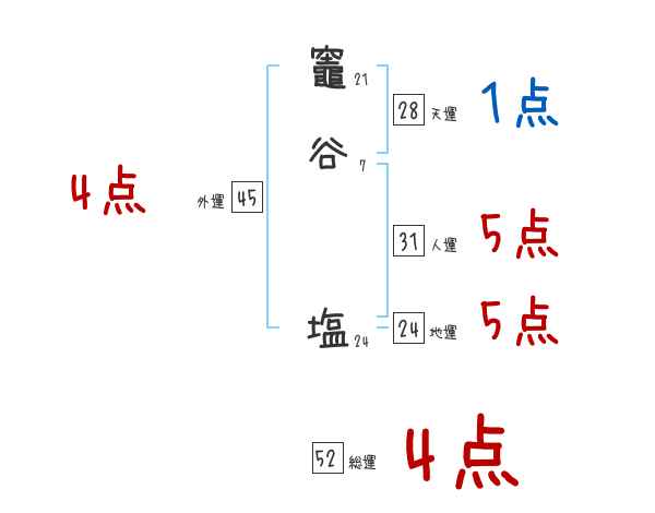 天運![]() | 竈谷塩さんの天運は28画の1つ星!家庭環境に注意。スポーツで活躍できる能力があるかも。 家系が持つ宿命的な運勢を表します。祖先から受け継いだ苗字ですので自分の力が及びません。家柄を象徴します。 |