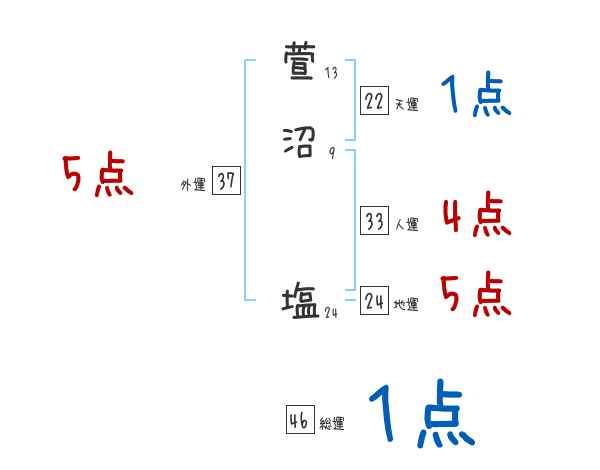 総運![]() | 萱沼塩さんの総運は46画の1つ星!迷走することが多く苦労するかも。目先のことにとらわれないように。 あなたの人生を表す1番重要な運勢です。生涯を通じて影響する総合運となり、主に50歳以降の晩年期に影響を及ぼします。 |