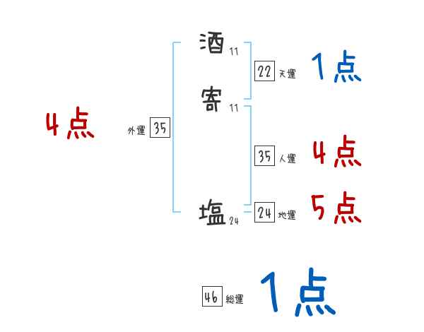 人運![]() | 酒寄塩さんの人運は35画の4つ星!温厚な性格で感受性が高い。穏和な性格で人望が厚い。 性格や才能などを表す2番目に重要な運勢です。人間関係や協調性、社会的な成功に影響します。主に20歳から50歳ぐらいまでの中年期の運勢を表します。 |