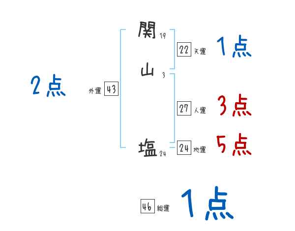 人運![]() | 関山塩さんの人運は27画の3つ星!頭脳明晰だが強情で摩擦が多い傾向。孤立に注意。 性格や才能などを表す2番目に重要な運勢です。人間関係や協調性、社会的な成功に影響します。主に20歳から50歳ぐらいまでの中年期の運勢を表します。 |