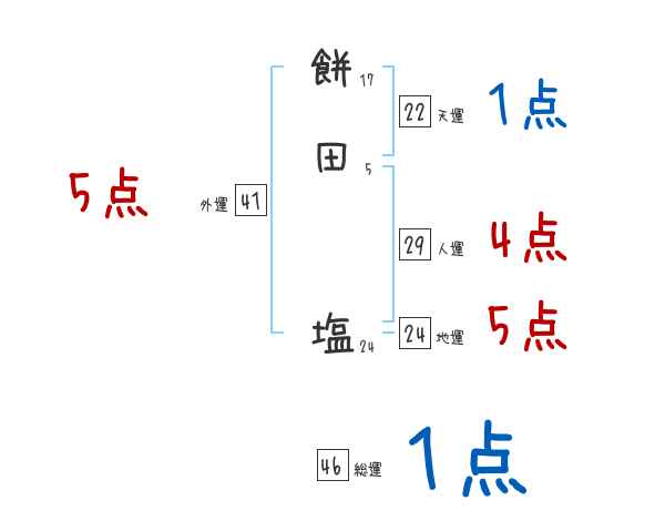 人運![]() | 餅田塩さんの人運は29画の4つ星!完全主義で才能がある。厳格な心の持ち主。 性格や才能などを表す2番目に重要な運勢です。人間関係や協調性、社会的な成功に影響します。主に20歳から50歳ぐらいまでの中年期の運勢を表します。 |