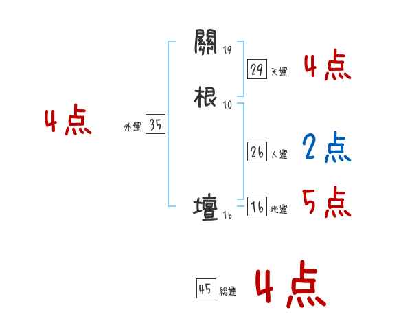 天運![]() | 關根壇さんの天運は29画の4つ星!完全主義で才能がある。厳格な心の持ち主。 家系が持つ宿命的な運勢を表します。祖先から受け継いだ苗字ですので自分の力が及びません。家柄を象徴します。 |