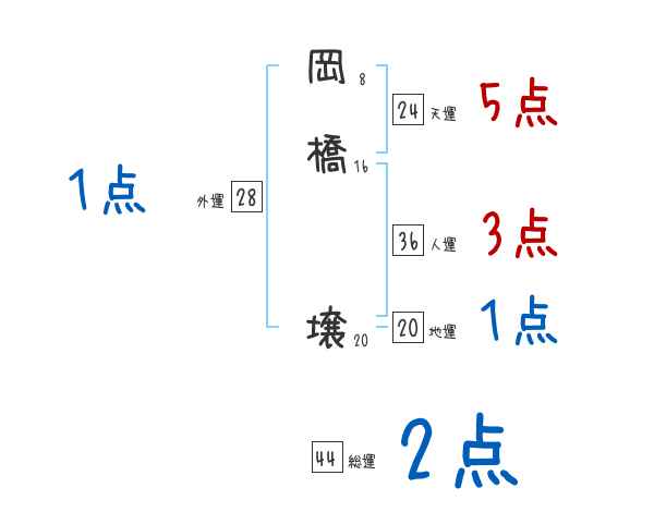 総運![]() | 岡橋壌さんの総運は44画の2つ星!誠実で慎重な性格。物事を考えすぎないように注意しましょう。 あなたの人生を表す1番重要な運勢です。生涯を通じて影響する総合運となり、主に50歳以降の晩年期に影響を及ぼします。 |