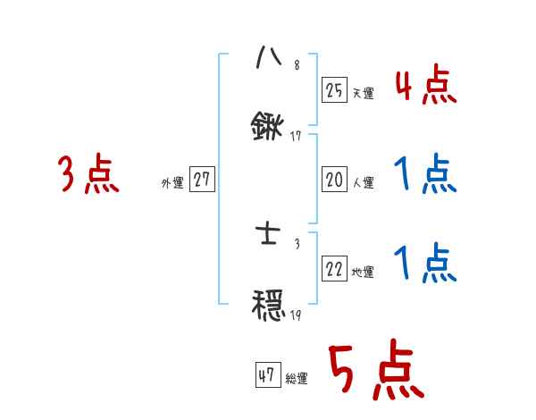 天運![]() | 八鍬士穏さんの天運は25画の4つ星!個性があり才能があふれる。強運の持ち主で発展する。 家系が持つ宿命的な運勢を表します。祖先から受け継いだ苗字ですので自分の力が及びません。家柄を象徴します。 |