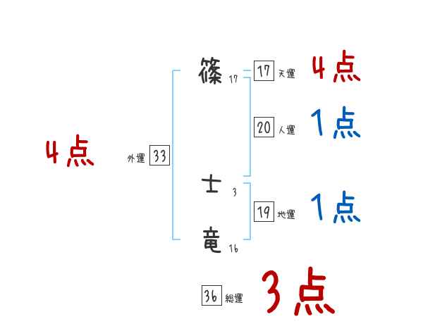 外運![]() | 篠士竜さんの外運は33画の4つ星!権力志向でプライドが高い。勇気があり運を切り開き成功する。 生活面を象徴する運勢です。外部から受ける影響力を表し、結婚運、家庭運や職場、環境への順応性を表します。 |