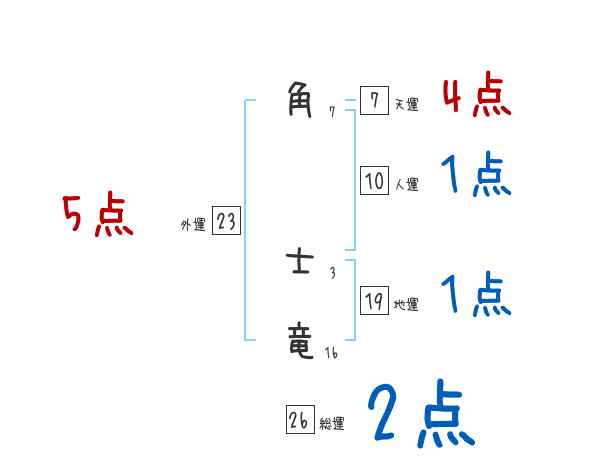 天運![]() | 角士竜さんの天運は7画の4つ星!強い意志や信念を持ち独立心が強い。自立する。 家系が持つ宿命的な運勢を表します。祖先から受け継いだ苗字ですので自分の力が及びません。家柄を象徴します。 |