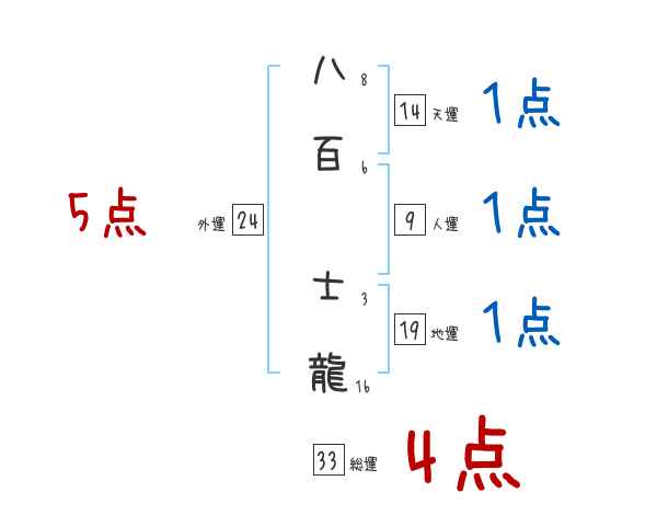 外運![]() | 八百士龍さんの外運は24画の5つ星!家庭運が良く順調な人生。金運にも恵まれる。 生活面を象徴する運勢です。外部から受ける影響力を表し、結婚運、家庭運や職場、環境への順応性を表します。 |