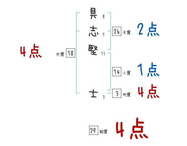 天運![]() | 具志堅士さんの天運は26画の2つ星!波瀾万丈かも。信頼できる人を大事にしましょう。 家系が持つ宿命的な運勢を表します。祖先から受け継いだ苗字ですので自分の力が及びません。家柄を象徴します。 |
