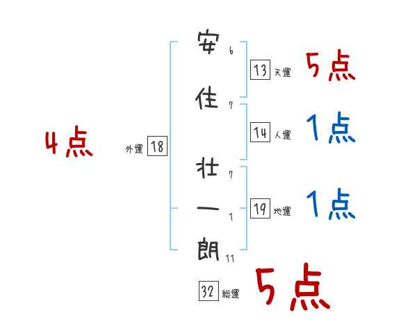 外運![]() | 安住壮一朗さんの外運は18画の4つ星!情熱的で剛気。忍耐力があり信頼される。 生活面を象徴する運勢です。外部から受ける影響力を表し、結婚運、家庭運や職場、環境への順応性を表します。 |