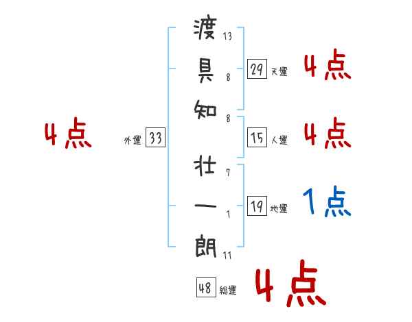 外運![]() | 渡具知壮一朗さんの外運は33画の4つ星!権力志向でプライドが高い。勇気があり運を切り開き成功する。 生活面を象徴する運勢です。外部から受ける影響力を表し、結婚運、家庭運や職場、環境への順応性を表します。 |