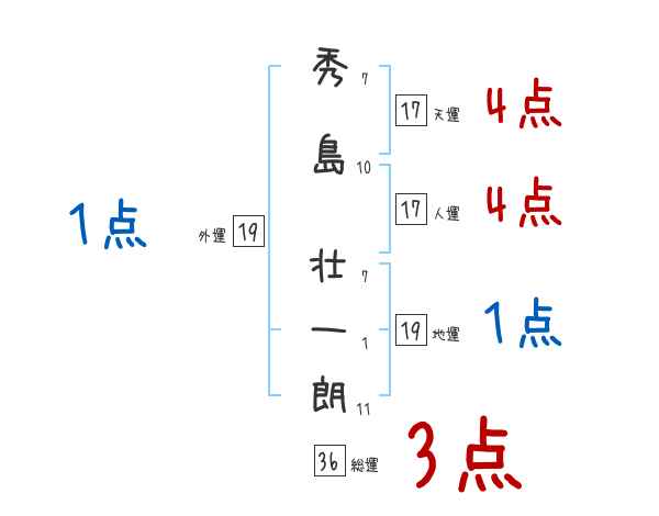 外運![]() | 秀島壮一朗さんの外運は19画の1つ星!優れた才能を持ちますが、協調性が足りないことも。周りの人と協力する事を意識しましょう。 生活面を象徴する運勢です。外部から受ける影響力を表し、結婚運、家庭運や職場、環境への順応性を表します。 |