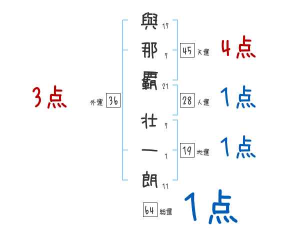 天運![]() | 與那覇壮一朗さんの天運は45画の4つ星!もくもくと物事を進め達成する。地味な努力家。 家系が持つ宿命的な運勢を表します。祖先から受け継いだ苗字ですので自分の力が及びません。家柄を象徴します。 |