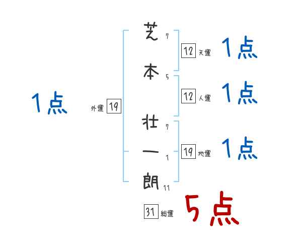 天運![]() | 芝本壮一朗さんの天運は12画の1つ星!簡単な失敗で諦めてしまいやすいかも。着実に行動すると良いでしょう。 家系が持つ宿命的な運勢を表します。祖先から受け継いだ苗字ですので自分の力が及びません。家柄を象徴します。 |