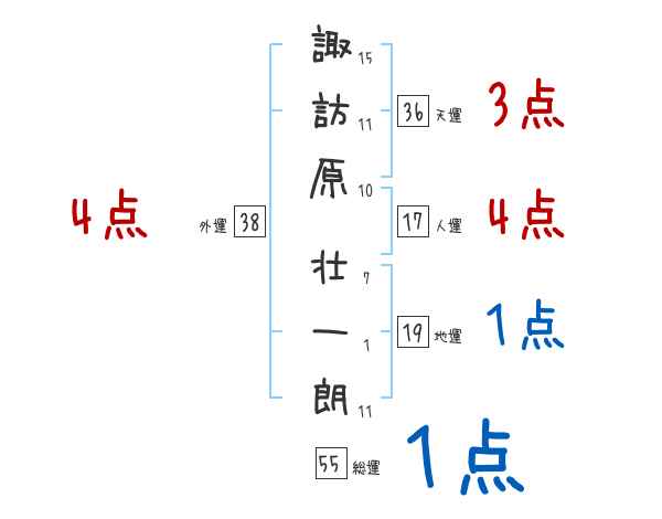 外運![]() | 諏訪原壮一朗さんの外運は38画の4つ星!温厚な性格で技術的な才能を発揮する。職人的な仕事に向いている。 生活面を象徴する運勢です。外部から受ける影響力を表し、結婚運、家庭運や職場、環境への順応性を表します。 |
