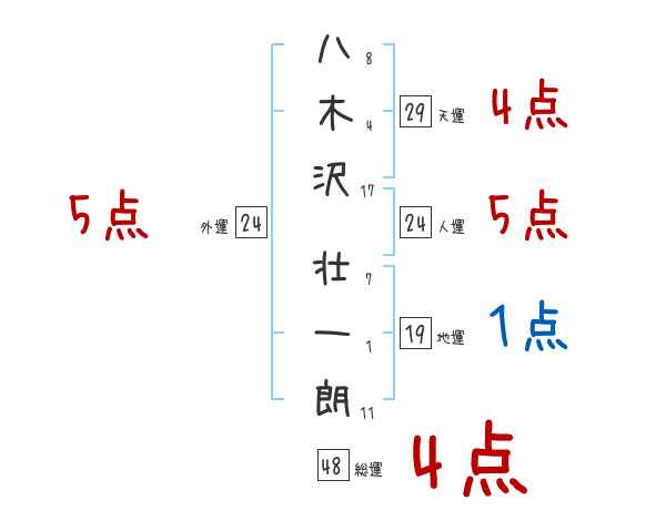 外運![]() | 八木沢壮一朗さんの外運は24画の5つ星!家庭運が良く順調な人生。金運にも恵まれる。 生活面を象徴する運勢です。外部から受ける影響力を表し、結婚運、家庭運や職場、環境への順応性を表します。 |