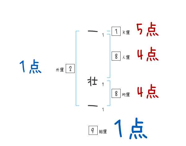 天運![]() | 一壮一さんの天運は1画の5つ星!行動力、指導力があり出世し繁栄する。幸運に恵まれる。 家系が持つ宿命的な運勢を表します。祖先から受け継いだ苗字ですので自分の力が及びません。家柄を象徴します。 |