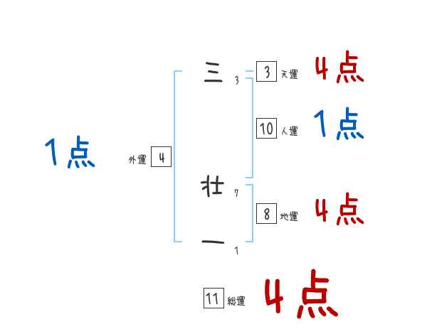 天運![]() | 三壮一さんの天運は3画の4つ星!活動的で才能に恵まれ、多くの信頼を得る。希望に満ち成長する。 家系が持つ宿命的な運勢を表します。祖先から受け継いだ苗字ですので自分の力が及びません。家柄を象徴します。 |