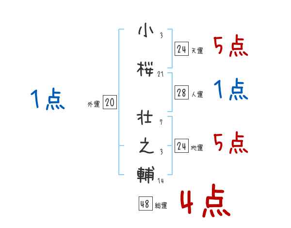 天運![]() | 小桜壮之輔さんの天運は24画の5つ星!家庭運が良く順調な人生。金運にも恵まれる。 家系が持つ宿命的な運勢を表します。祖先から受け継いだ苗字ですので自分の力が及びません。家柄を象徴します。 |